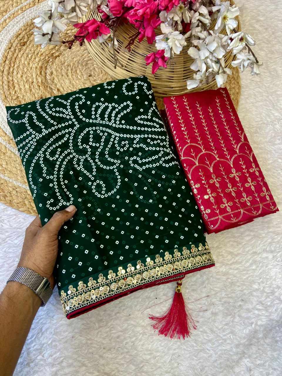 | Name : | RC Green Bandhej Georgette heavy Coding Sequence border Saree |